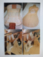 Image 1, clockwise from top left: photos 1 and 3 are of a guitar by René Voboam, Paris. The original, and most guitars by the Voboam family, have banding like that around the rose of photos 2 and 4, around the complete body and fingerboard. The rose shown is copied from a guitar by Jean Voboam. Image 2 shows the process of constructing the Jean Voboam rose. Mainly parchment, oil gilded.